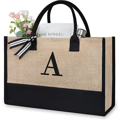 TOPDesign Initial Jute/Canvas Tote Bag, Personalized Present Bag, Suitable for Wedding, Birthday, Beach, Holiday
