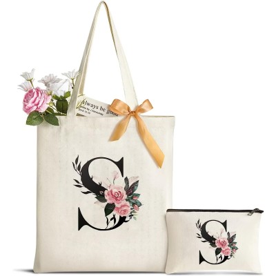 AUNOOL Initial Floral Canvas Tote Bag 2 Pockets, Personalized Wedding Gift Bag for Women Bridesmaid