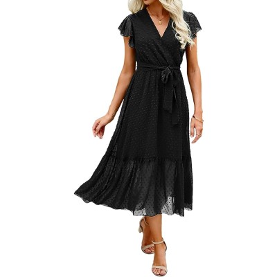 BTFBM Women Summer Bohemian Floral Casual Wrap V Neck Ruffle Cap Sleeveless Belt A-Line Pleated Hem Swing Midi Sun Dress
