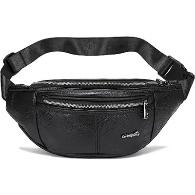 OrrinSports Black Fanny Pack for Men Genuine Leather Waist Bag Multiple Pockets Metal Zippers Belt Bag